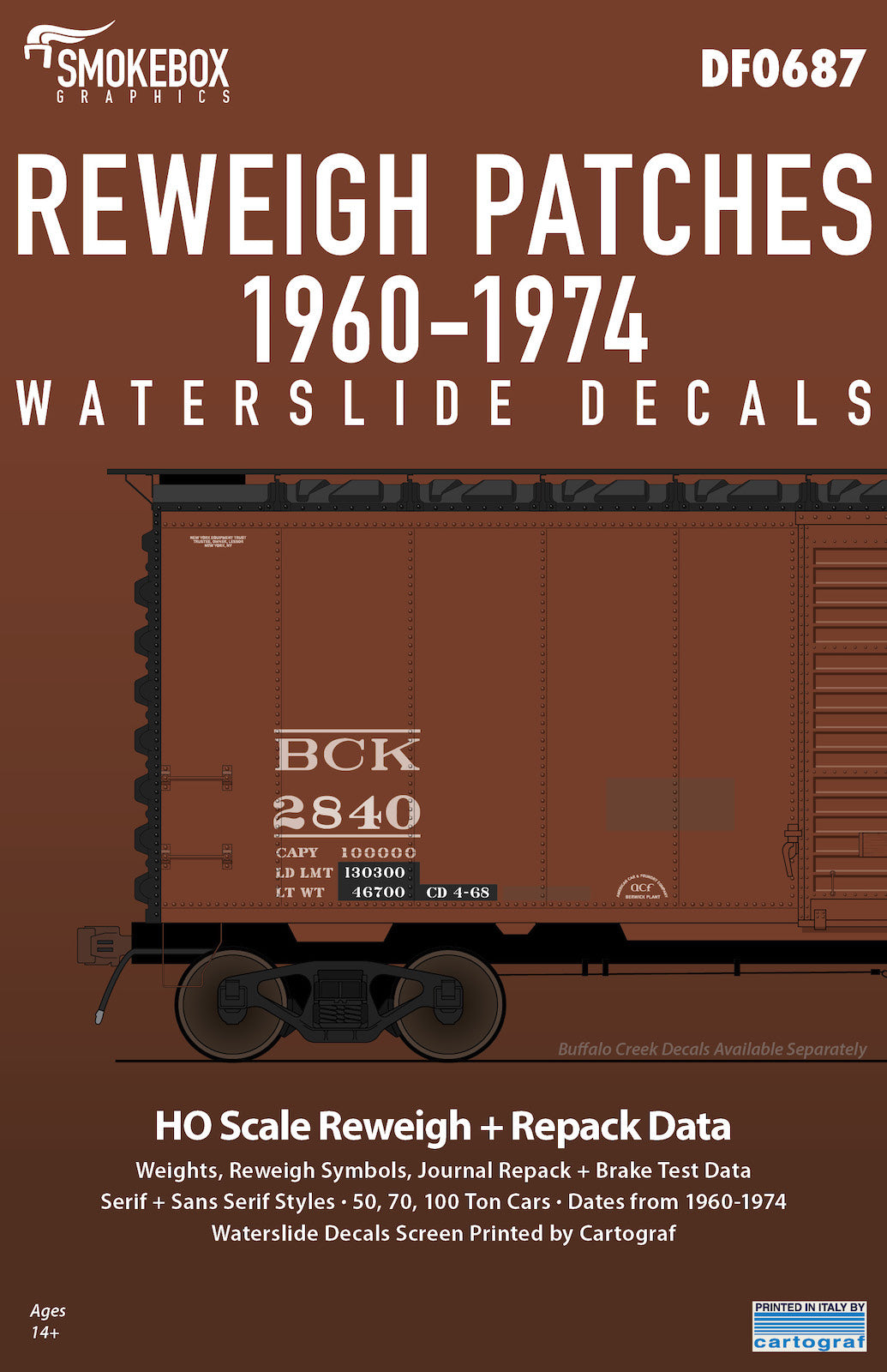 HO Scale Waterslide Decals. Decal set with patch data for reweighed freight cars. Covers dates from 1960-1974 (change in allowable axle load thru COTS). Weights for 50, 70, and 100 ton cars, plus repack and brake test stencils. Two styles, 60+ reweigh stations. Includes 8.5x11 fold-out sheet guide with prototype information. Our Paint Out Blanks are the perfect complement to this set!