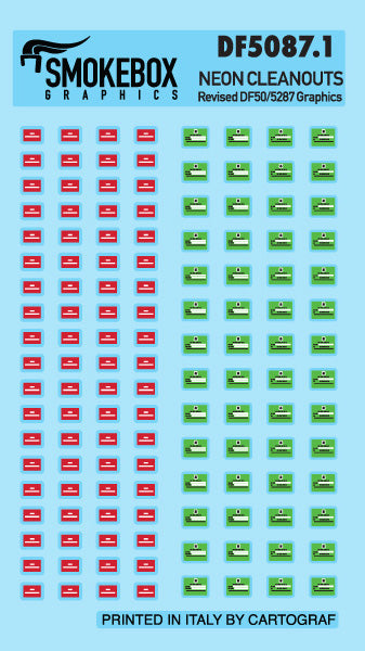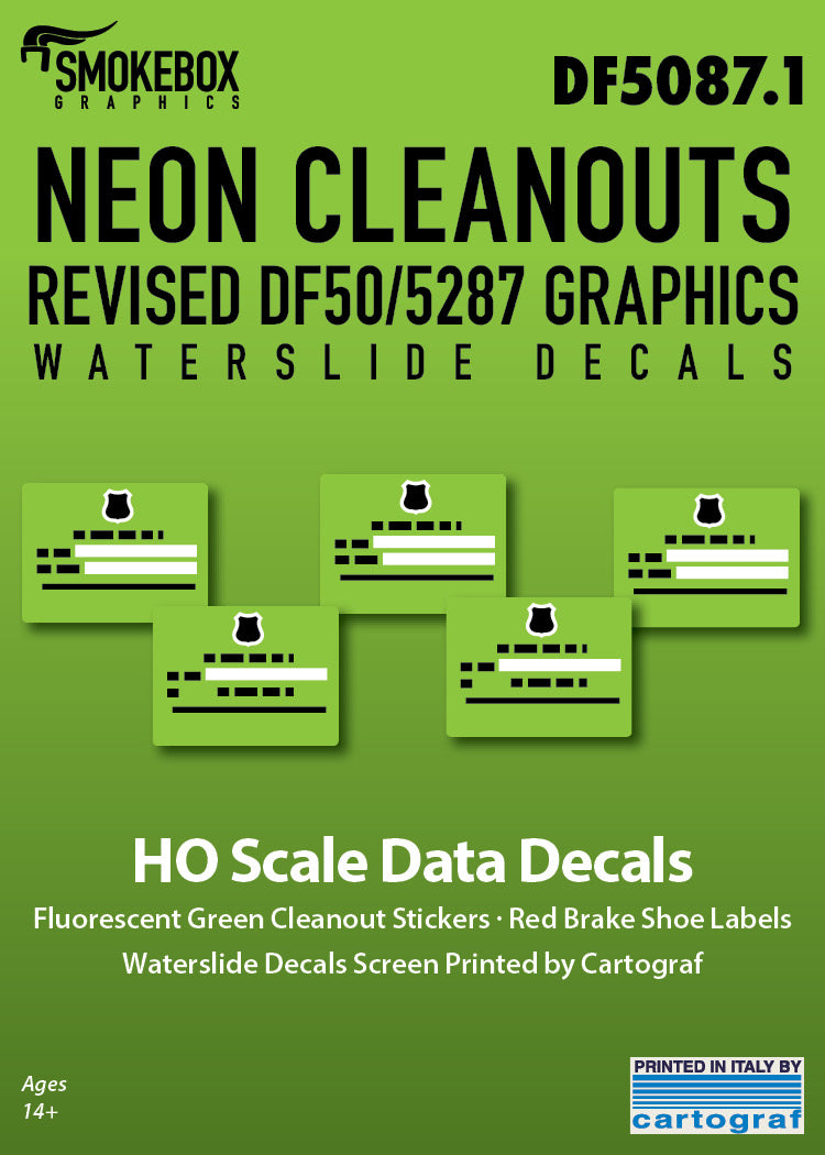 HO Scale Waterslide Decals. This small sheet includes the revised graphics from our second printing of DF50/5287, including the fluorescent green cleanout stickers found on many of today's freight cars.