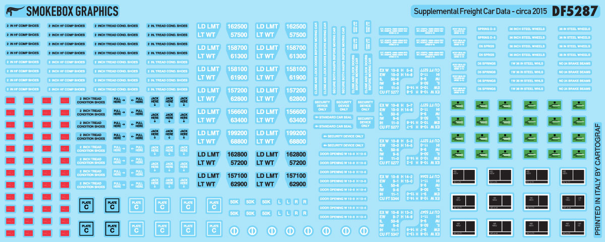 HO Scale Waterslide Decals. Decal set includes freight car data often missing on other sets along with some updated labels. Sheet includes mostly boxcar data, including door markings, weights, and dimensional data in a common font. Also includes "TREAD COND SHOES" brake shoe markings, red brake shoe labels, and green cleanout stickers.