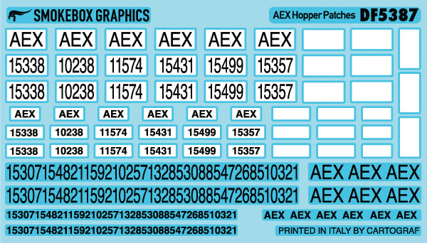 HO Scale Waterslide Decals. Mini decal set includes reporting mark patches for AEX (The Andersons) covered hoppers. This style of patching was common on many different types of hoppers including the ex-CNW "blue" Pullman Standard cars. Decal set includes white patches and enough reporting marks for 6 cars.