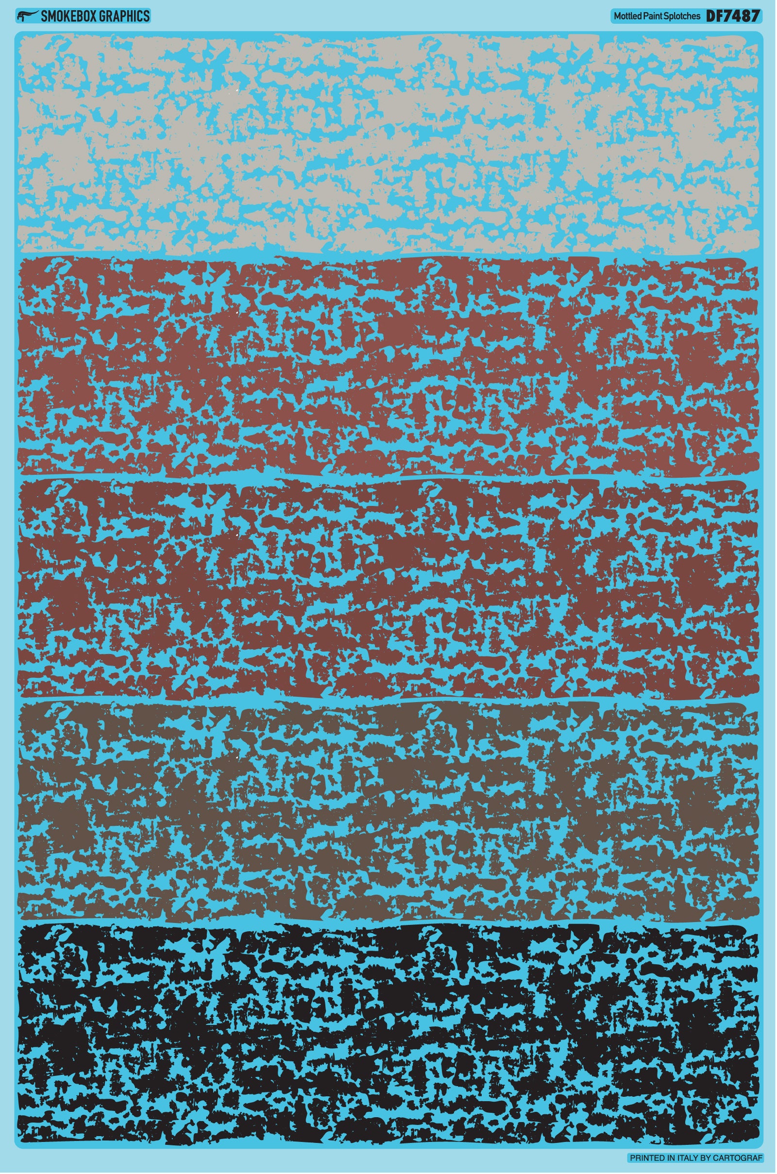 HO Scale Waterslide Decals. This decal sheet includes patches of color in mottled patterns intended to mimic paint failures. Patches of various sizes can be used to simulate paint that has "washed" from paint-outs, areas of adhesion failure, or poor paint application on a single door or panel.
