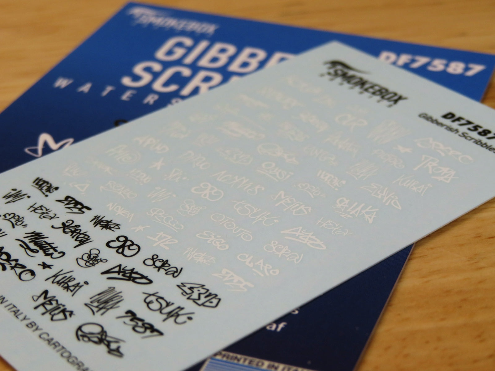 HO Scale Waterslide Decals. Mini decal set includes more than 80 different scribble graphics to mimic the small "tags" often found on railway equipment, either adjacent to larger graffiti panels or on their own. This sheet includes a mix of white and black printing.
