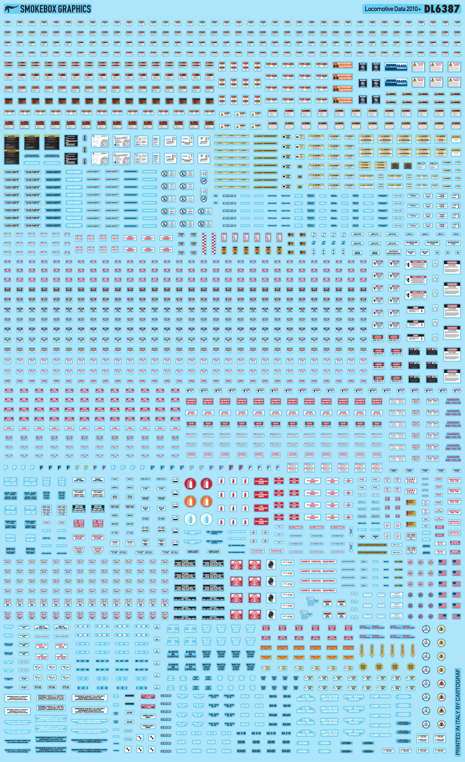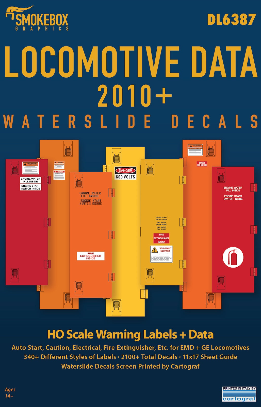 HO Scale Waterslide Decals. This complex sheet includes 340+ different styles of data used on locomotives with a total of 2100+ total decals. Auto Start, Caution, Electrical, Fire Extinguisher, etc. labels for both EMD and GE are all included. Sheet comes with full color 11x17 fold-out sheet guide.