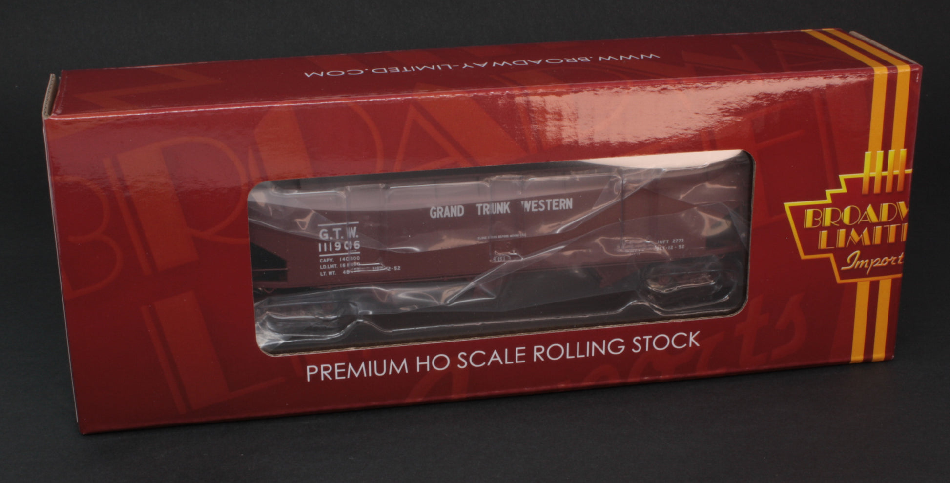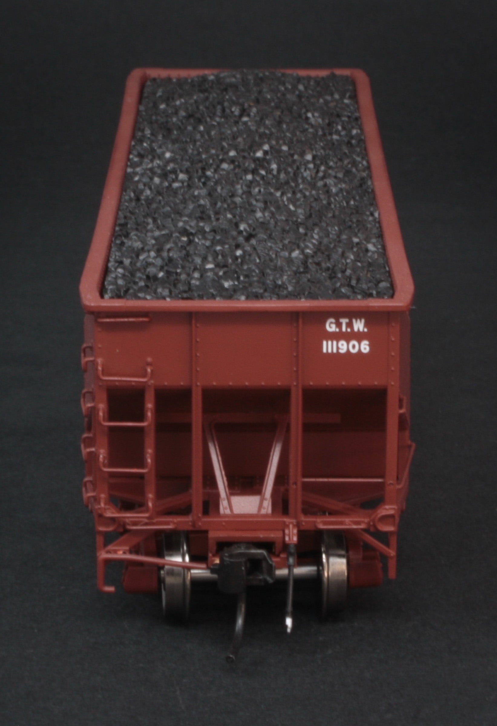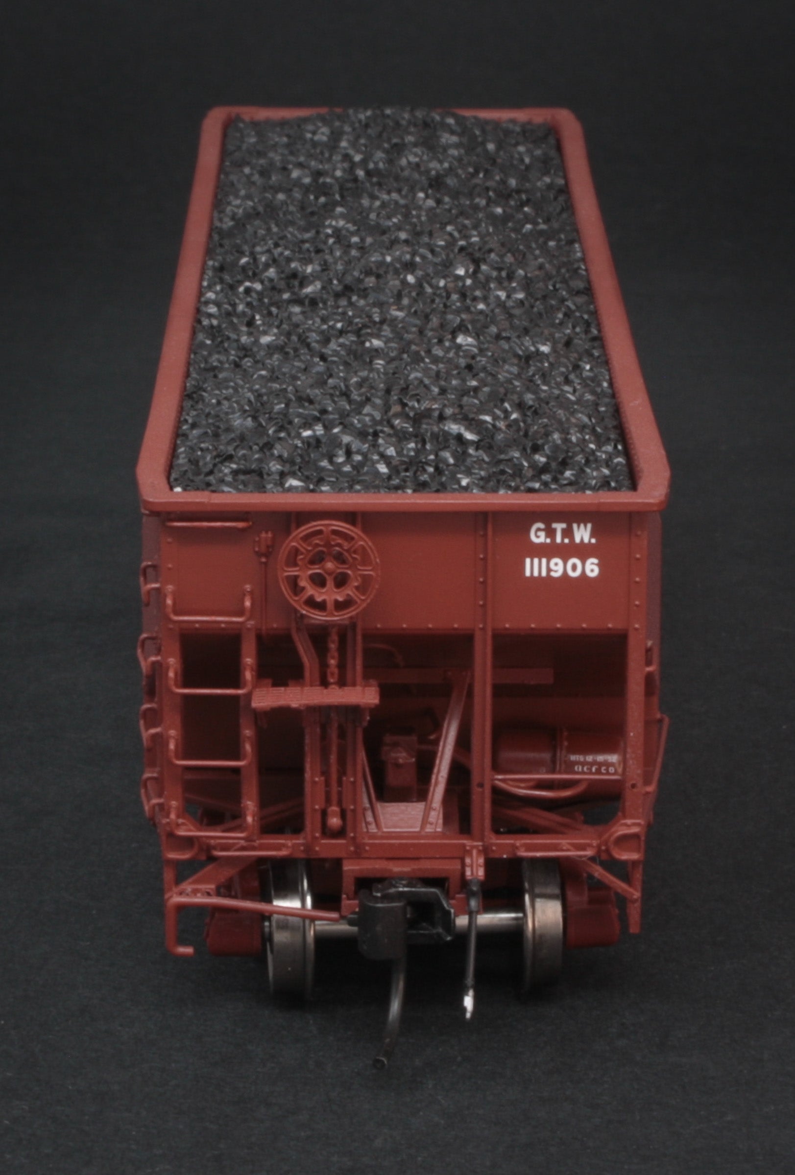 This ready-to-run HO Scale 70-ton AAR 3-bay hopper car is factory decorated for Grand Trunk Western in the as-delivered mineral red scheme. Build date is 12/52 with NEW weigh date, pack date, and brake test date also in 12/52. Model features wire grab irons, metal wheelsets, metal knuckle couplers, interior bracing, and removable coal load. Graphics were created by Smokebox and have been intricately reproduced, including builder's logos and brake cylinder stencils.